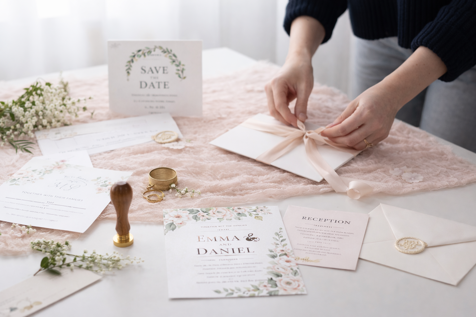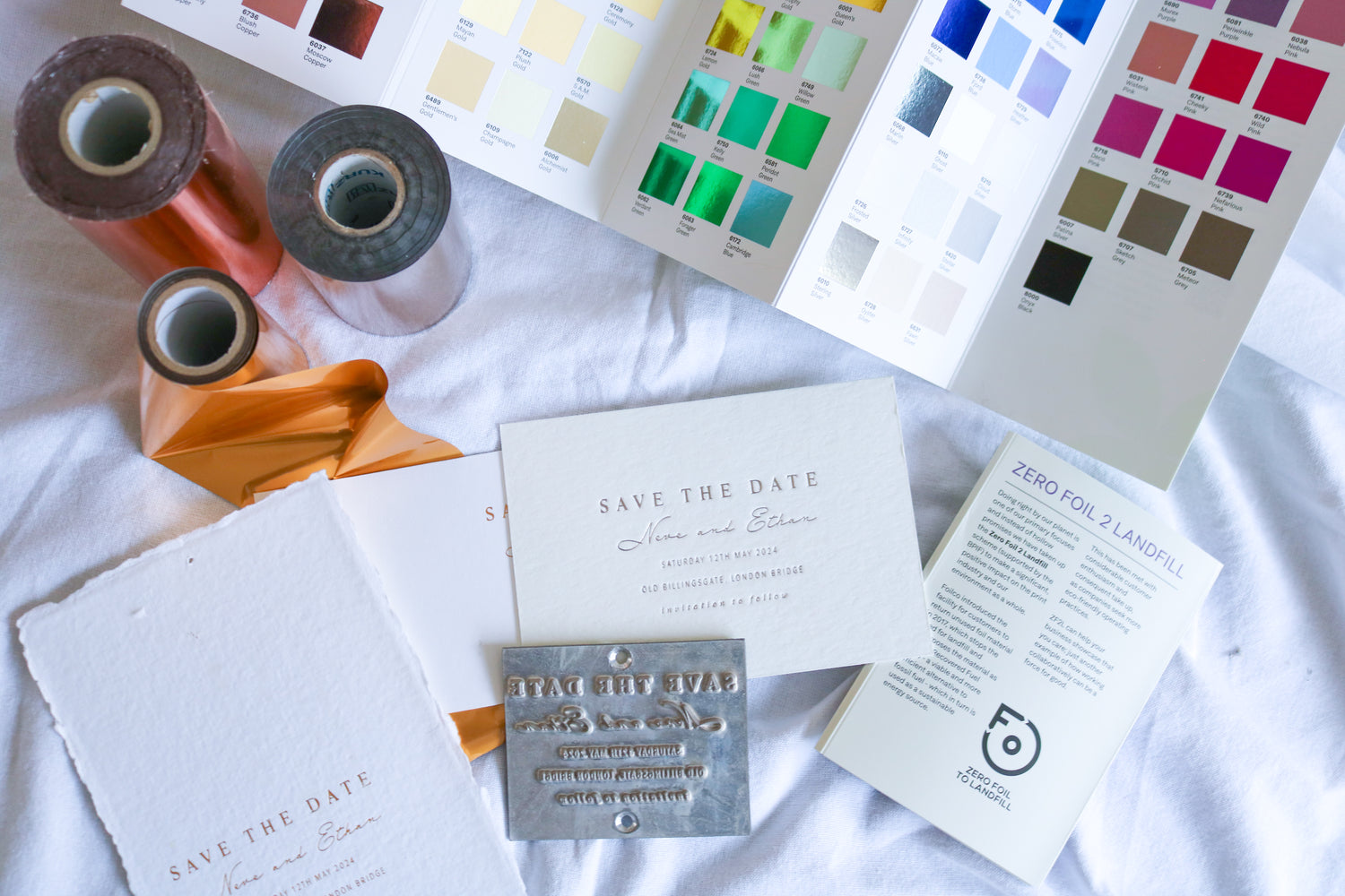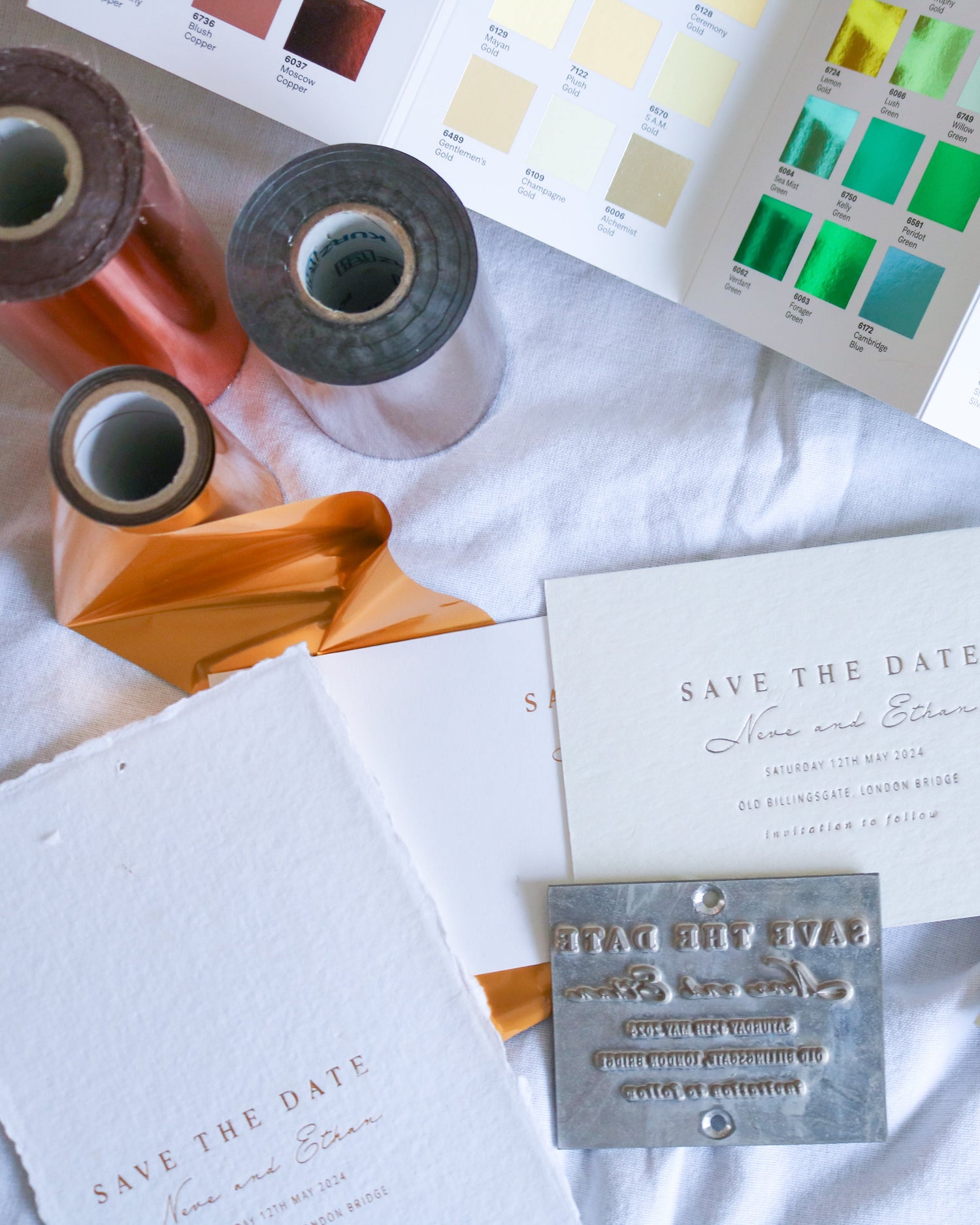 Every wedding invitation is designed and pressed in-house using traditional foil techniques and carefully selected paper stocks. The result is a crisp, tactile finish with real depth and clarity.
