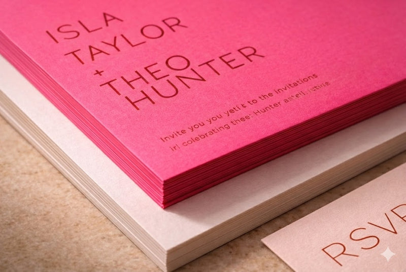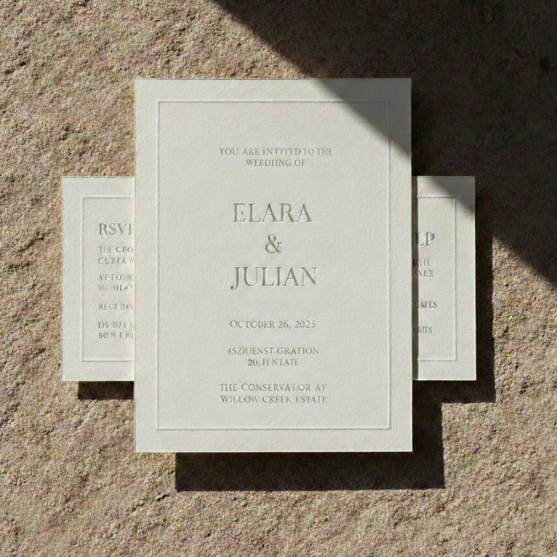 Foil may be subtle and tonal or bold and striking, always balanced. Where appropriate, we can develop a monogram or quiet illustration that adds character without overwhelming the layout.