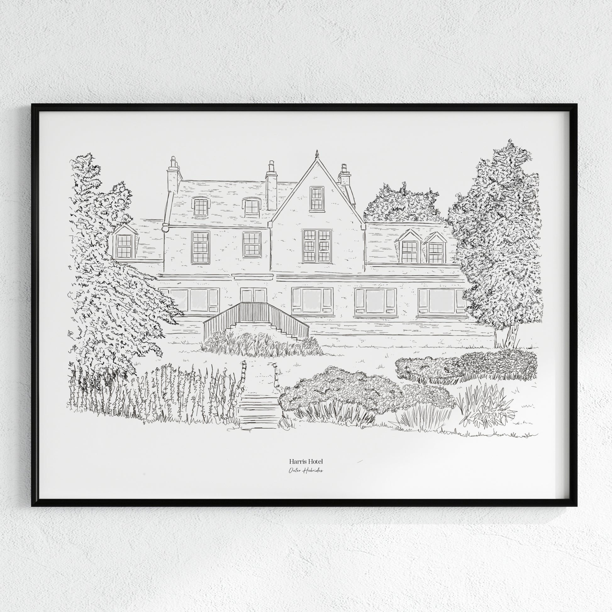 Harris Hotel, a picturesque venue captured in a stunning and detailed illustration .