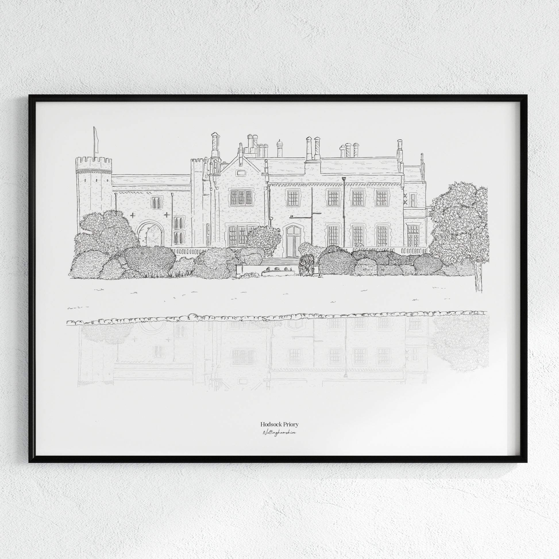 Hodsock Priory, a historic country house wedding venue set in 800 acres of countryside, captured in a stunning illustration.
