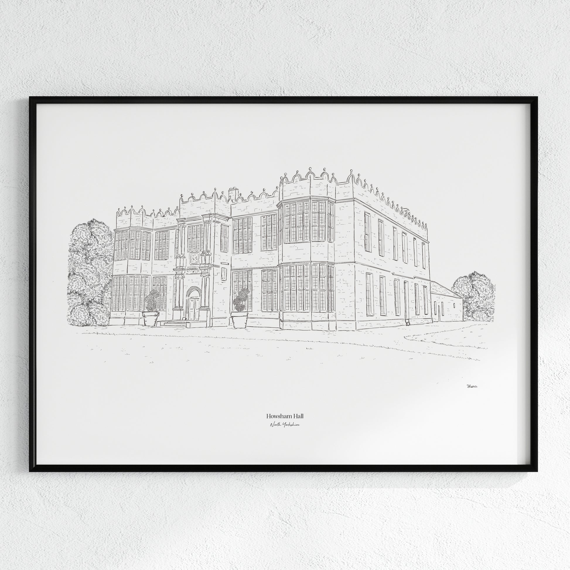 A grade I listed Jacobean stately home in Howsham, North Yorkshire, captured in a beautiful illustration.
