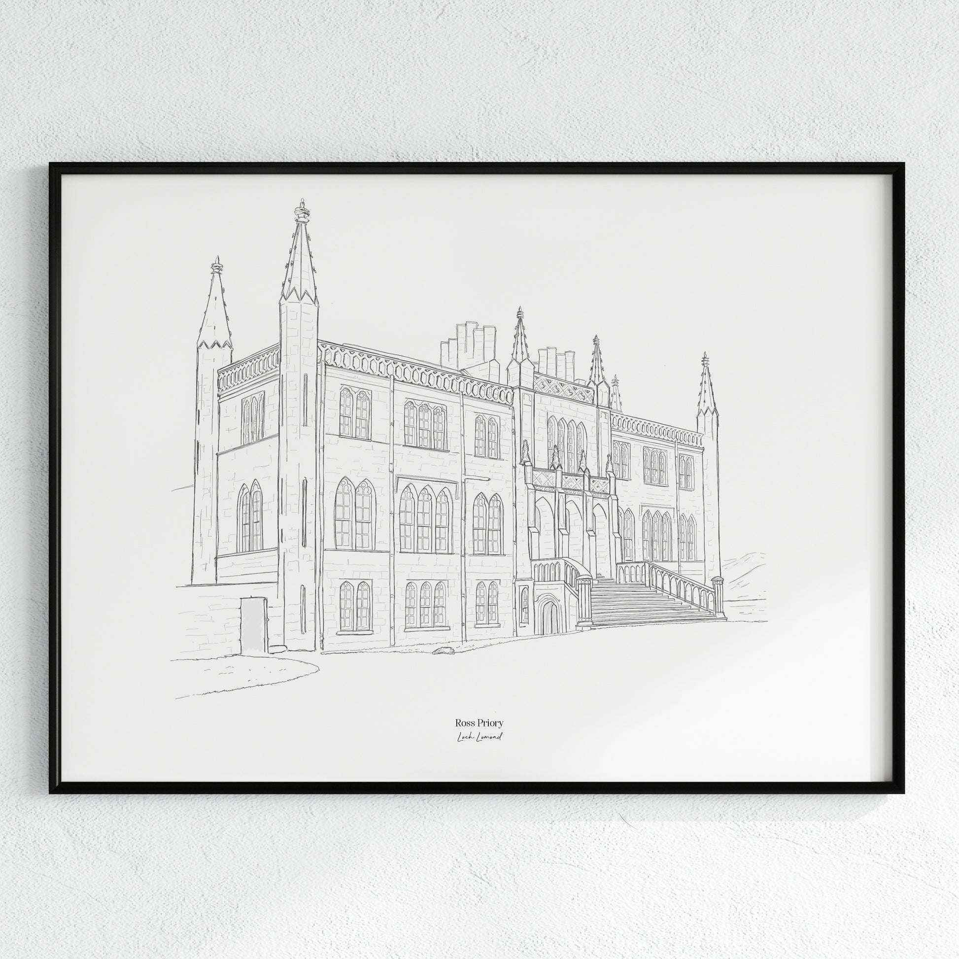 Ross Priory, one of the finest examples of Gothic architecture in Scotland, captured in a stunning illustration.