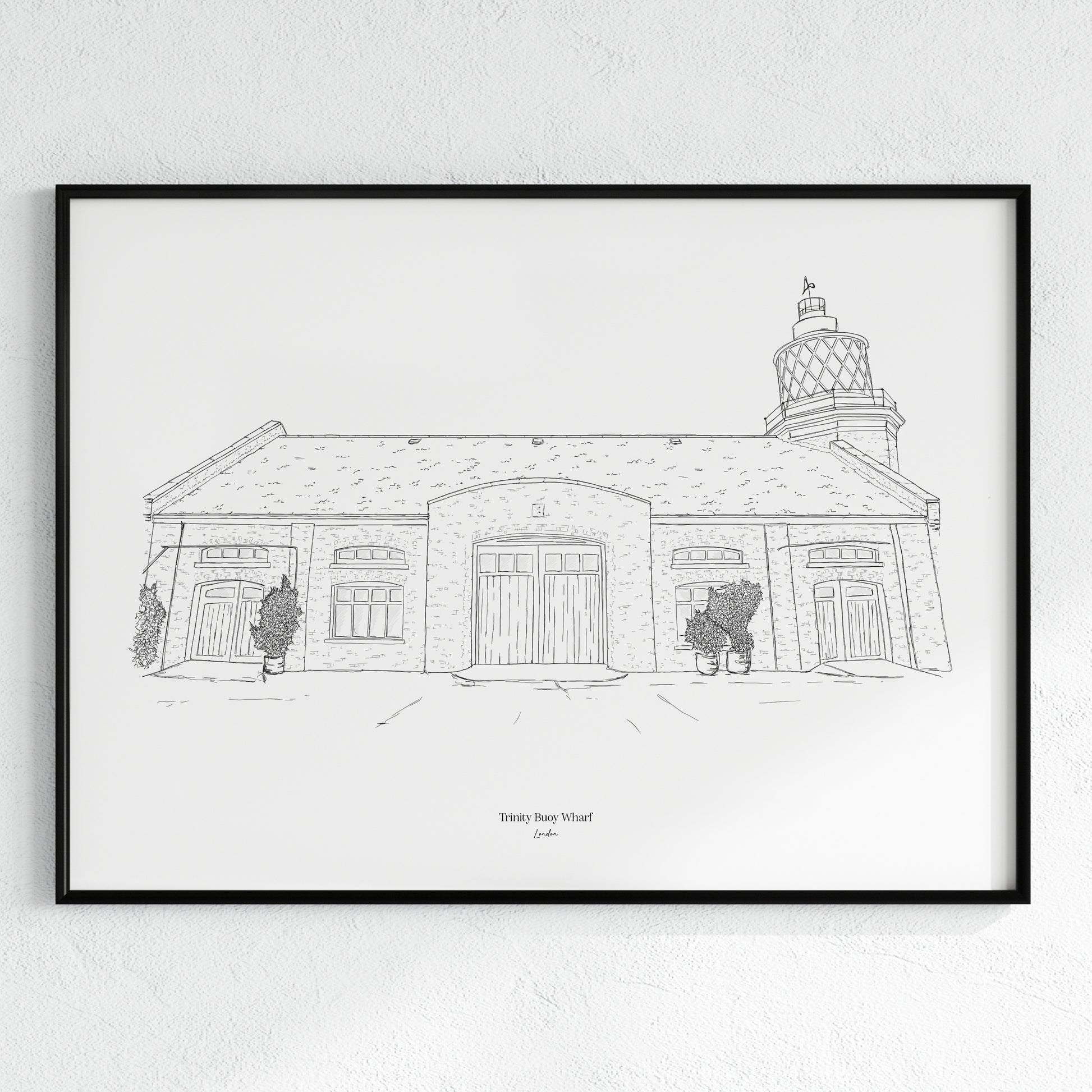 Trinity Buoy Wharf, a Grade II listed brick building on the banks of the river Thames in East London, captured in a striking illustration.
