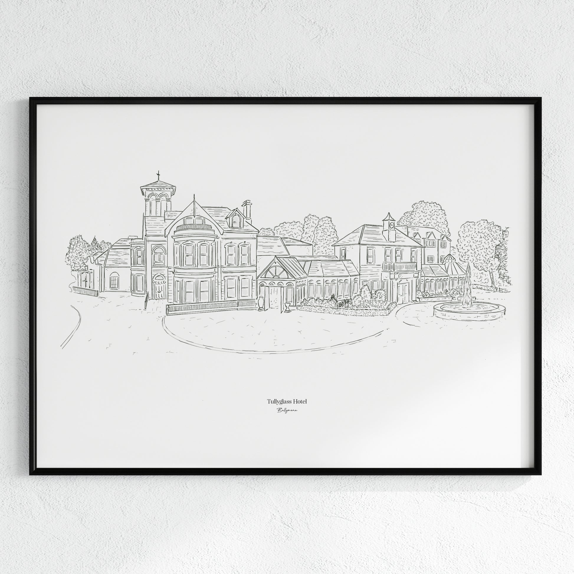 Tullyglass Hotel, Ballymena, an imposing country residence dating from 1890, captured in a stunning illustration.