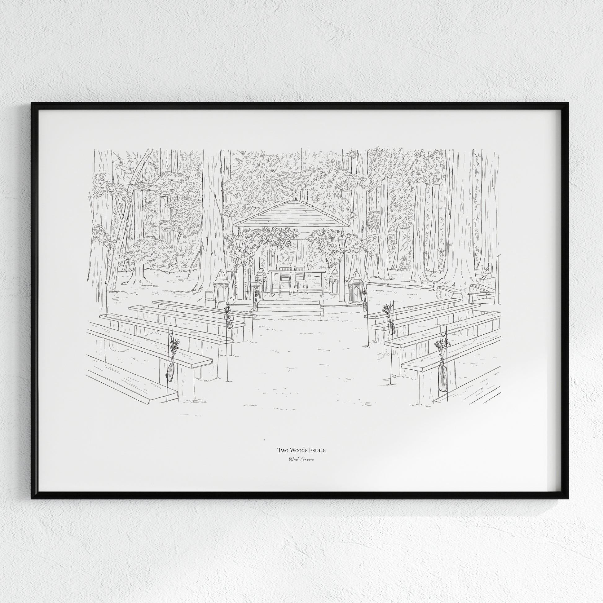 Two Woods Estate, a breathtaking and unique woodland wedding venue set in the heart of West Sussex, captured in a stunning illustration.