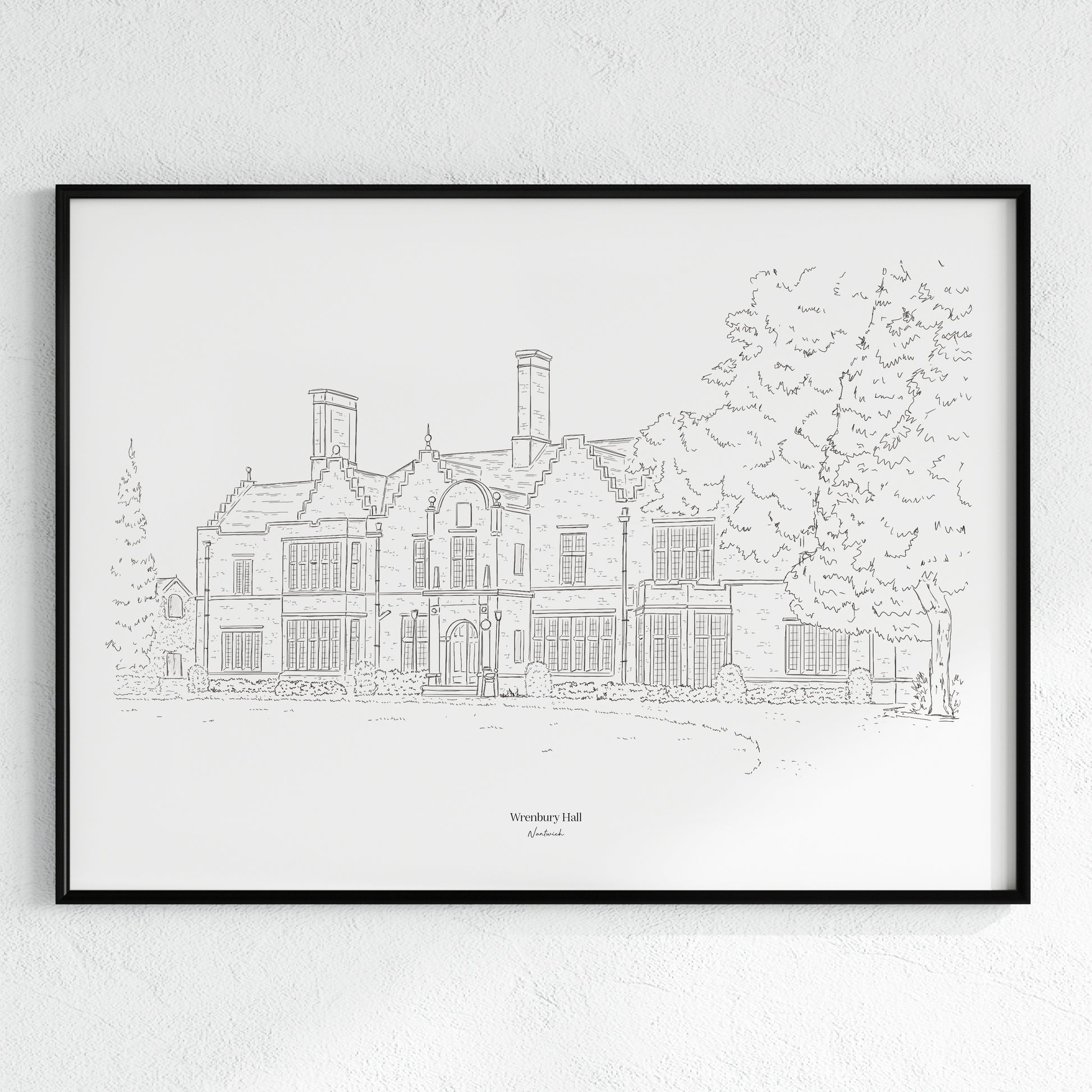 Wrenbury Hall, a historic wedding venue located in Nantwich, captured in a stunning illustration.